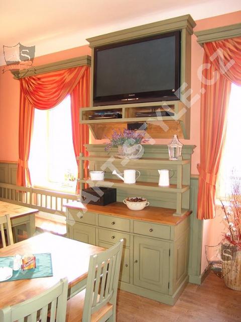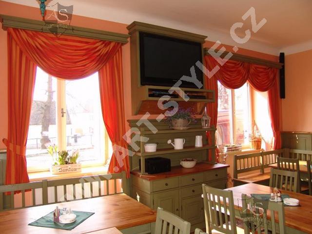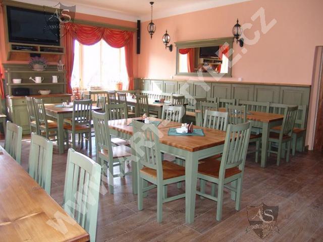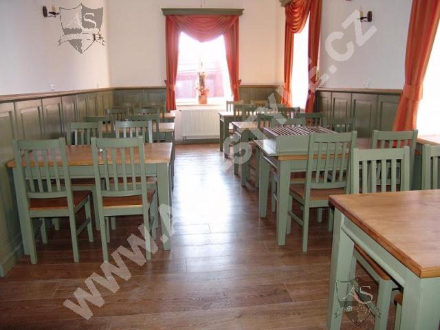 Le restaurant de Kácov (arrondissement de Kutná Hora) est équipé en mobilier de bois d’épicéa. L’équipement complet du restaurant consistait à la fabrication de 18 tables, 60 chaises et plusieurs bancs sans espace de rangement. La fabrication du bar, des stands TV et des boiseries sur les murs à hauteur de 1,33m était une partie constituante de la commande. L’habillage des meubles est en peinture de couleur vert cendré SG10 mélangé à des surfaces vernies naturelles.