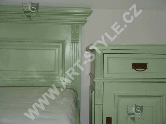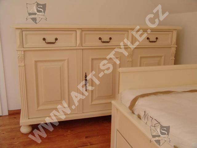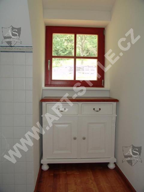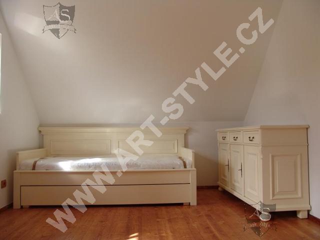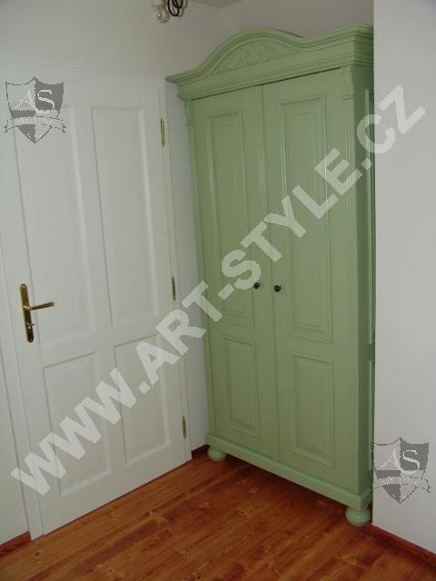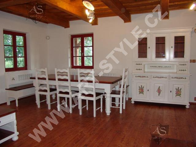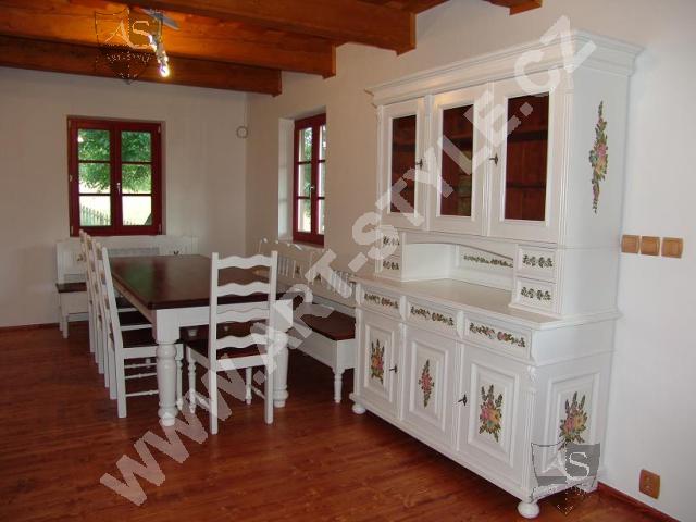 La maison de plaisance près de Zlín a été entièrement équipée par notre entreprise, allant de la cuisine au hall d’entrée en passant par le salon, la salle à manger, la chambre à coucher et la salle de bain. Le mobilier était notamment teinté de couleurs crème blanc et vert olive. Des motifs de fleurs peints paraissent sur certains meubles.